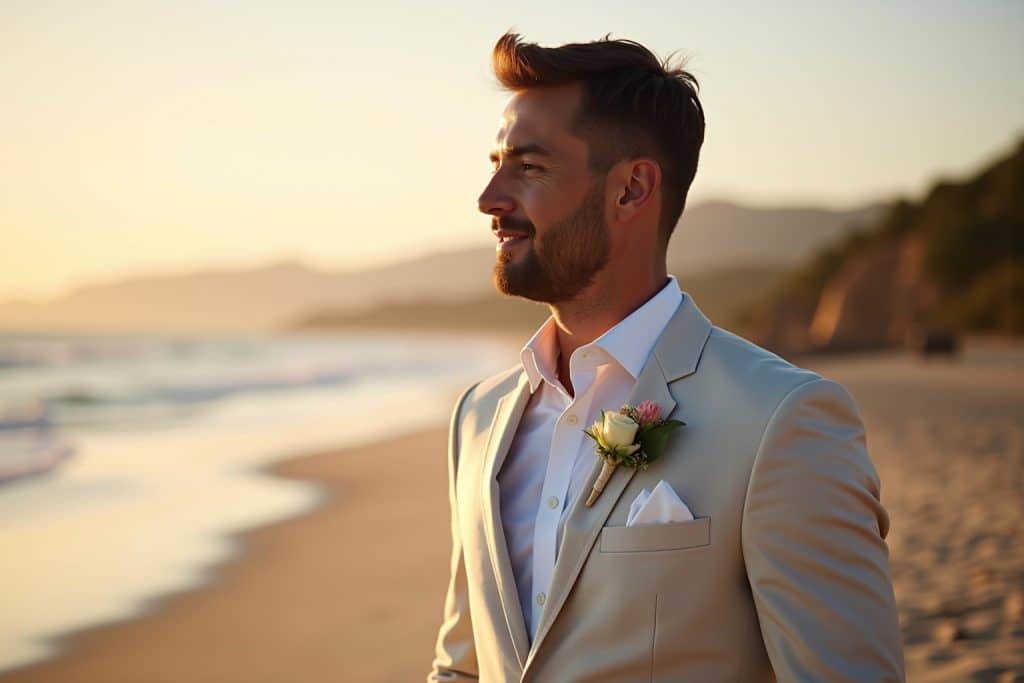 - Helle Farben: Beige, Creme, Hellgrau, Hellblau und Pastelltöne sind ideale Farben für ein sommerliches Bräutigam-Outfit. Sie wirken frisch, elegant und passen perfekt zu einer Hochzeit im Freien.