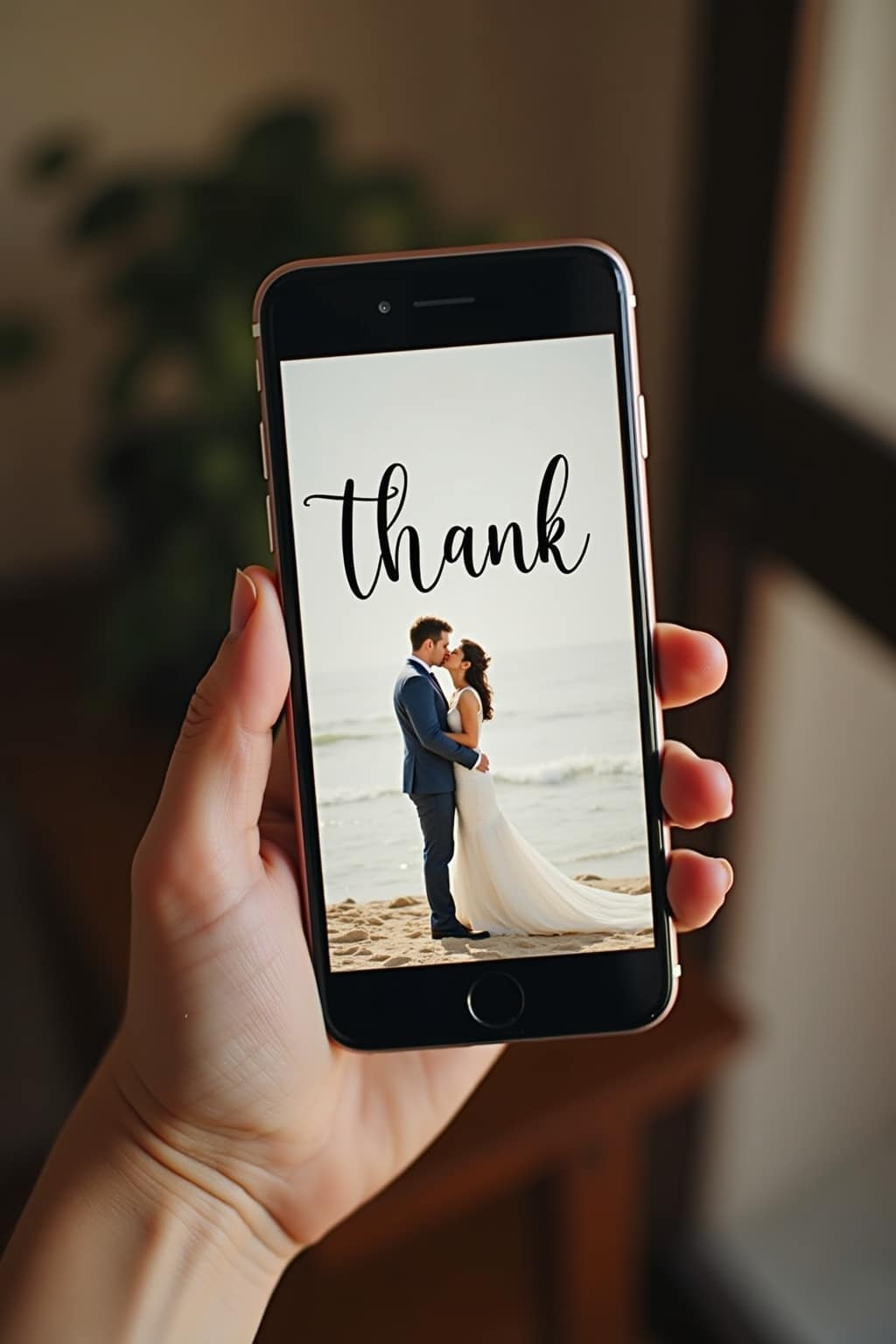 Nach den Feierlichkeiten können Sie Ihre Dankeskarten als WhatsApp Bilder kostenlos an alle Hochzeitsgäste versenden, was nicht nur Zeit und Geld spart, sondern auch umweltfreundlicher ist als gedruckte Karten. Mit den zahlreichen kostenlosen Vorlagen können Sie die Dankeskarten individuell gestalten und mit einem persönlichen Foto von der Hochzeit versehen. Die digitalen Dankeskarten erreichen Ihre Gäste sofort und können von diesen leicht gespeichert oder weitergeleitet werden. Nutzen Sie diese moderne Alternative, um allen Gästen für ihre Teilnahme, Geschenke und Glückwünsche zu danken, ohne zusätzliche Kosten für Druck und Versand tragen zu müssen.