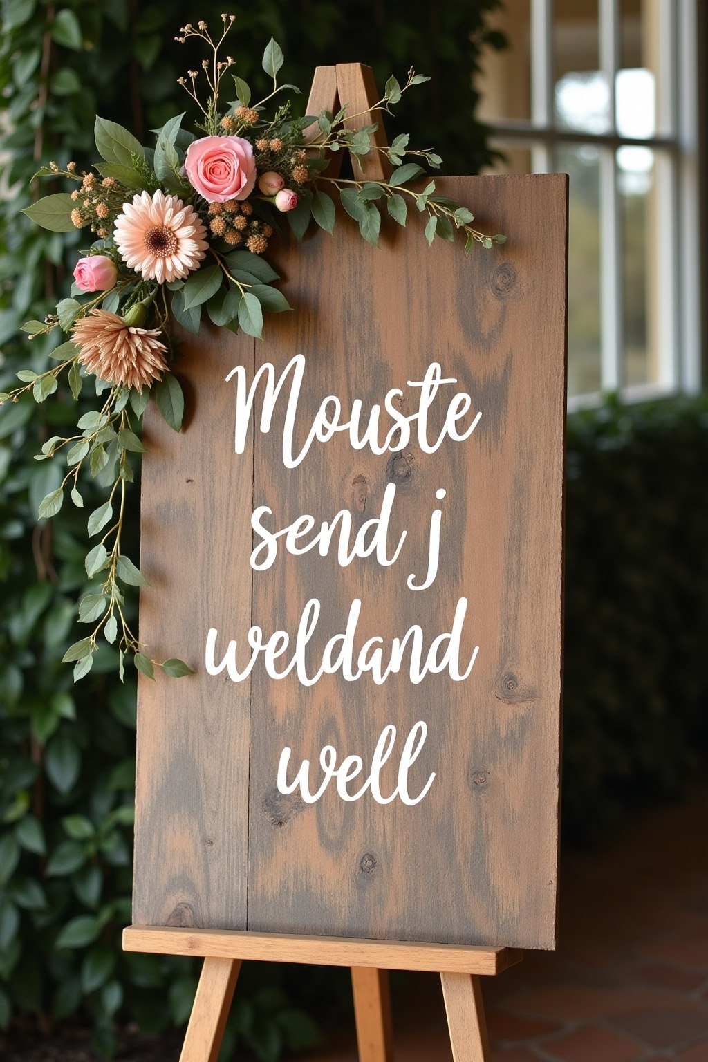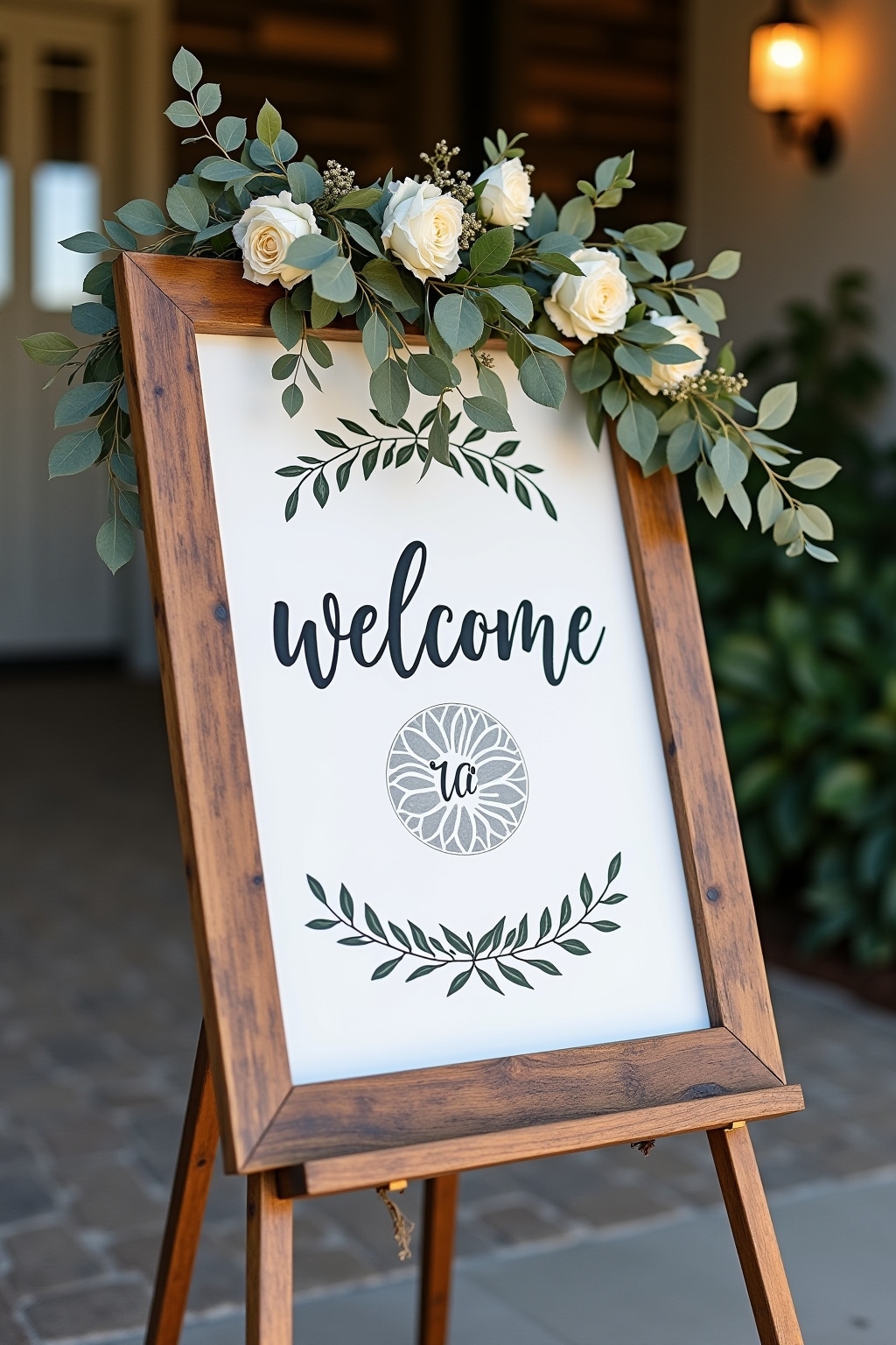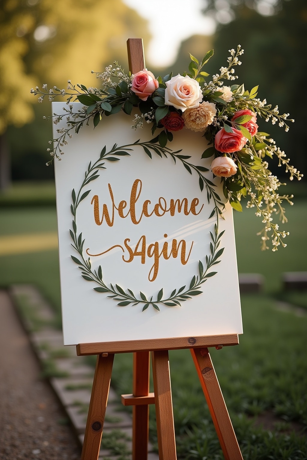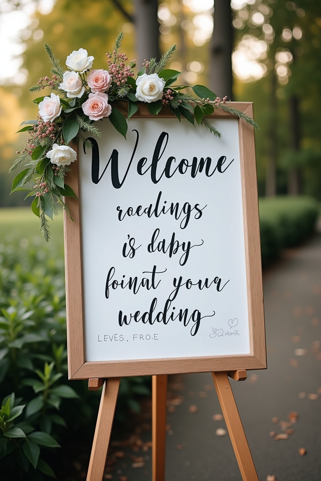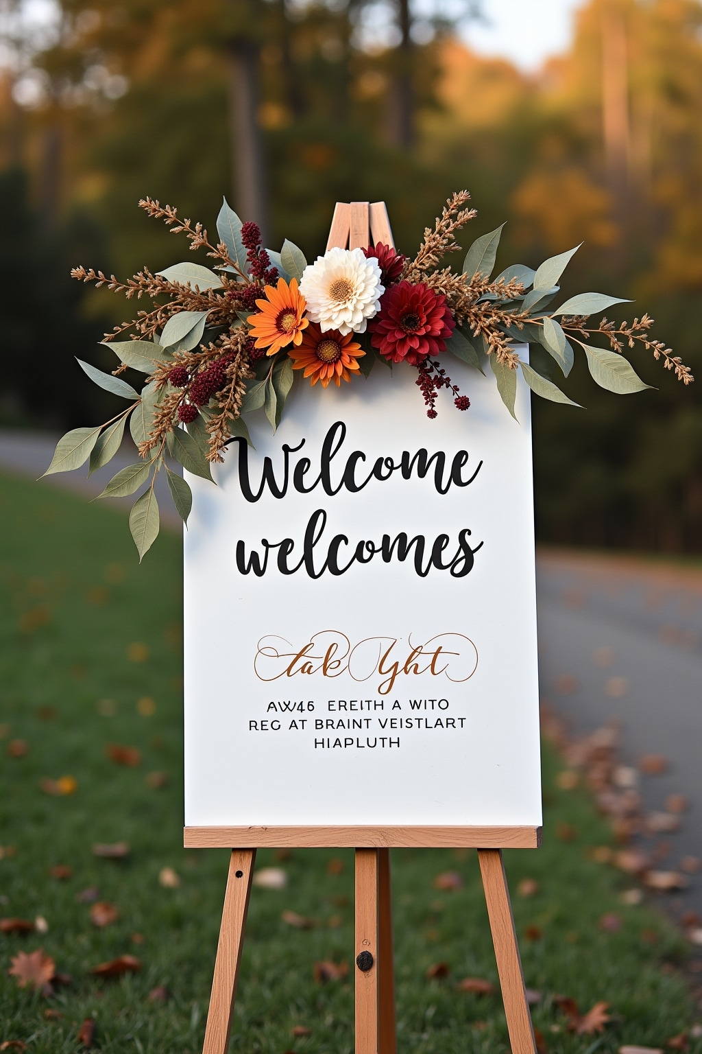- Das Willkommensschild kann als Vorgeschmack auf die saisonale Hochzeitsdekoration dienen.
